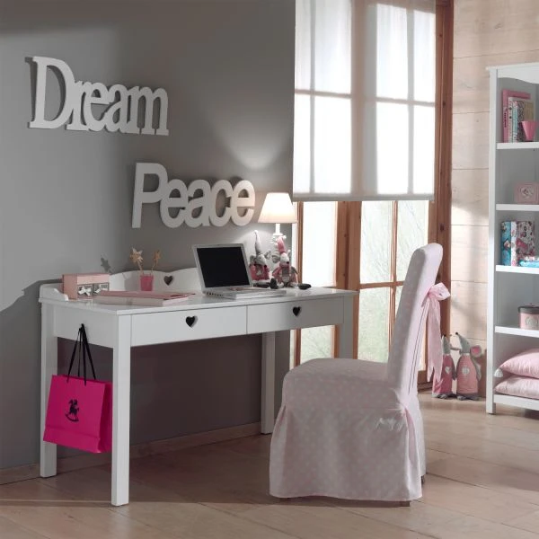 De Vipack Amori Bureau Wit heeft een romantische uitstraling en is gemaakt van kwalitatief MDF. Onder het bureaublad bevinden twee soft-close opbergladen. In de fronten van de bevinden hartjes uitsparingen die deze serie kenmerken. Een leuke aanvulling in de Amori kinderkamer.