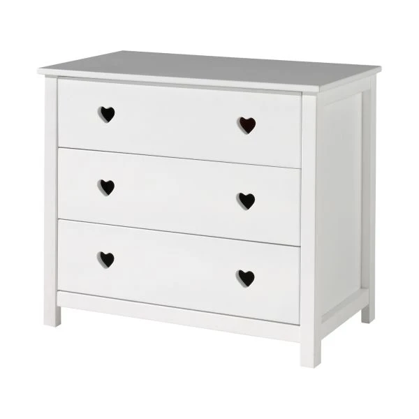 De Vipack Amori Commode Wit is een leuk meubel in een romantische look. Deze look wordt mede gecreëerd door de handgrepen in hartjesvorm. Het is een praktisch meubel met drie opbergladen die beschikken over voldoende opbergruimte. Het is vervaardigd van kwalitatief MDF materiaal.
