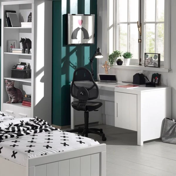 Het Vipack Erik Bureau Wit is een handig meubel in de kinderkamer. Bovenop zit er een dik bureaublad met daaronder een opbergkastje. In dit kastje kan veel opgeborgen worden en is er een legplank waardoor je twee opbergruimten krijgt. Het bureau biedt namelijk een plek om te spelen, knutselen of te studeren. Het front van het kastje beschikt over een verticaal reliëfstructuur wat de serie Erik kenmerkt. Verder is het bureau is vervaardigd van MDF met grenen waarvan de kwaliteit zeer uitstekend is.